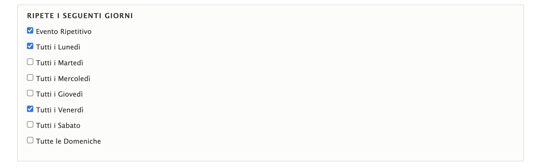 3. Nel caso in cui l'evento sia sempre identico ma si svolga ripetutamente, nel box "Ripete i seguenti giorni" flaggare "Evento ripetitivo" e i giorni della settimana in cui l'evento si ripeterà
